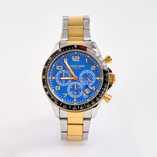 Black, blue, gold tone and silver tone