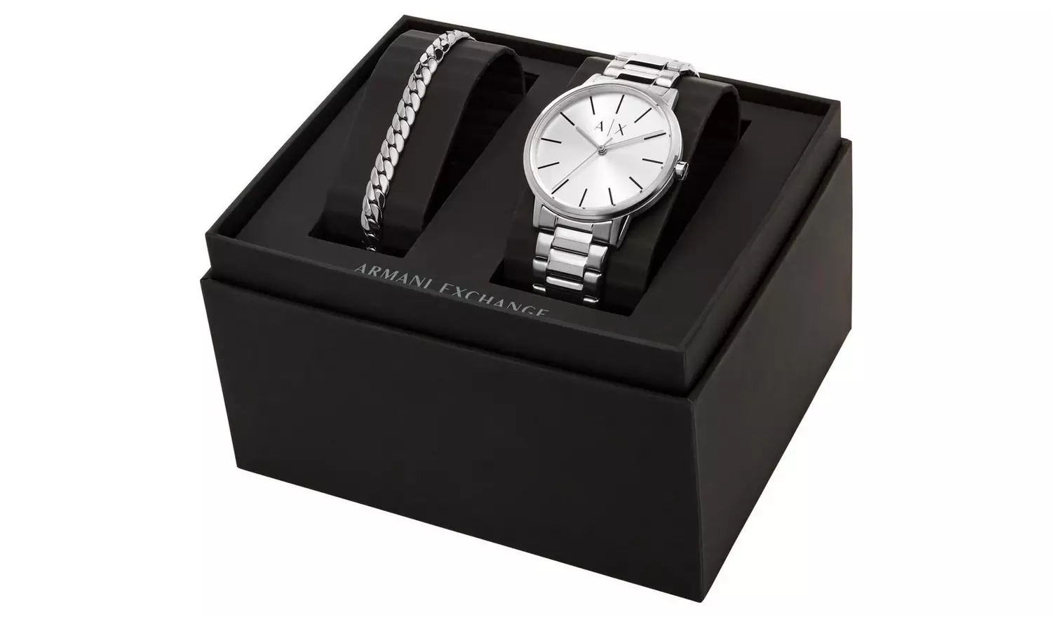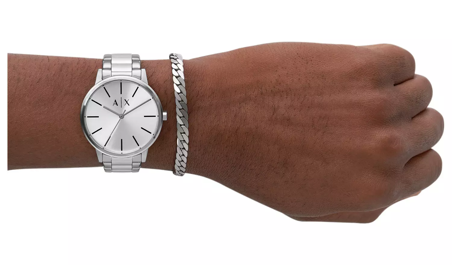 Armani Exchange Men’s Three-Hand, At Least 50% Recycled Stainless Steel Watch, AX7138SET. Armani Exchange’s gift set includes a stainless steel chain bracelet and a 42mm watch featuring a silver sunray dial, at least 50% recycled stainless steel case, three-hand movement and stainless steel bracelet.