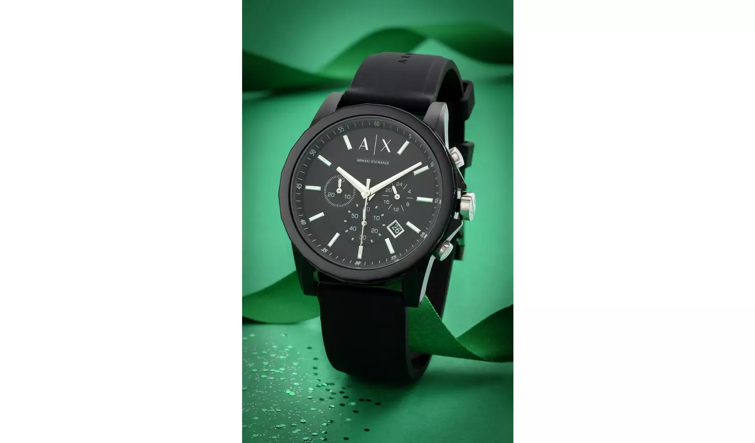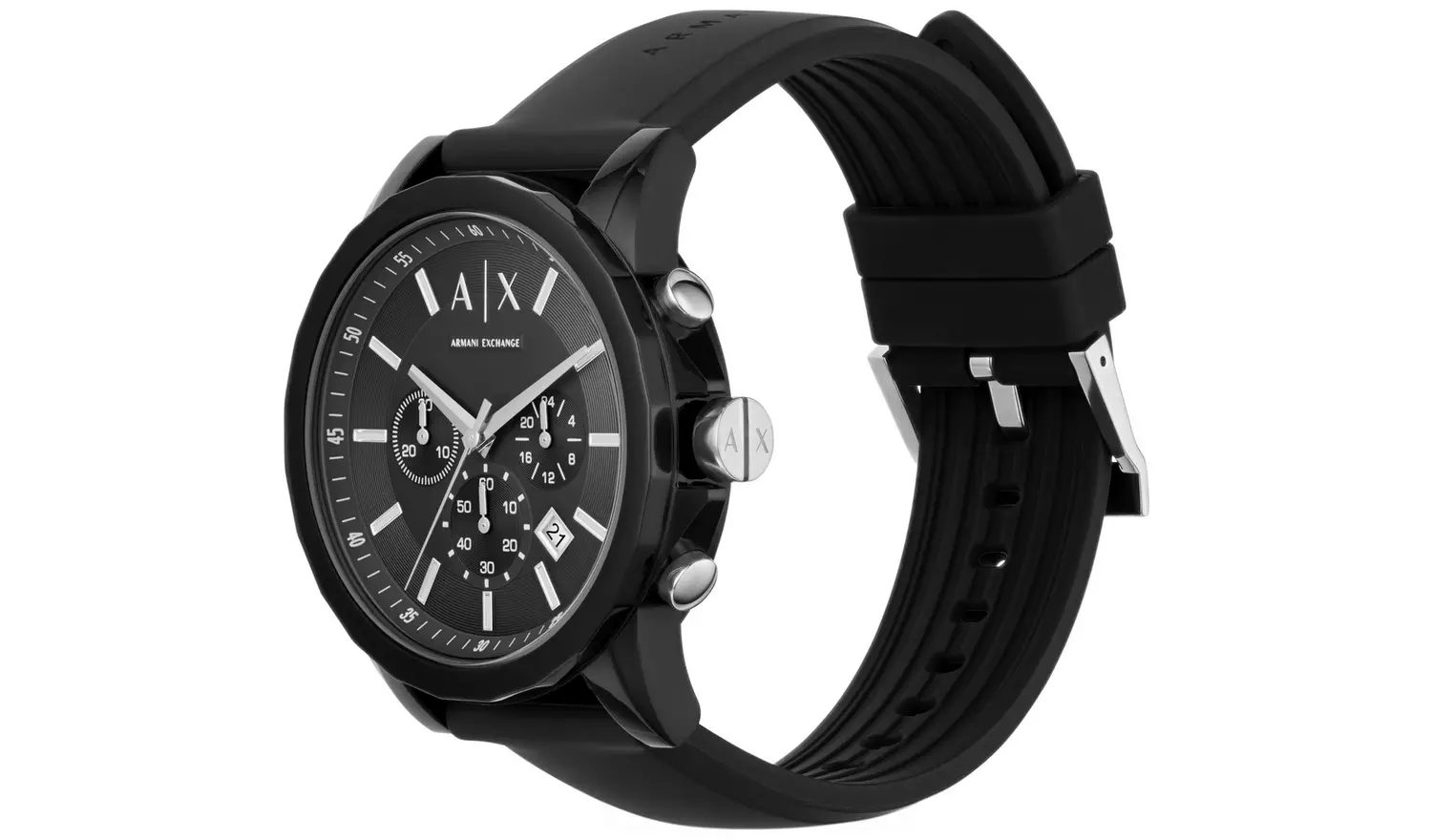 A sporty silicone strap anchors the bold black-on-black chronograph dial with silver-tone accents in this Men’s watch by Armani Exchange.