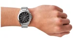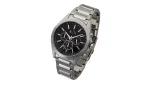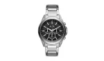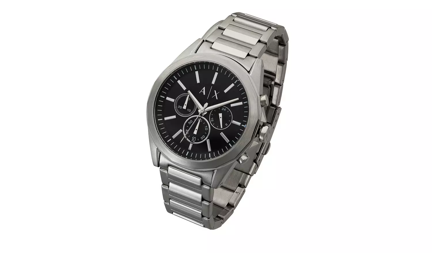 This Armani Exchange watch features a black sunray chronograph dial with striped inner dial, paired with a sleek stainless-steel case and Y-link bracelet.