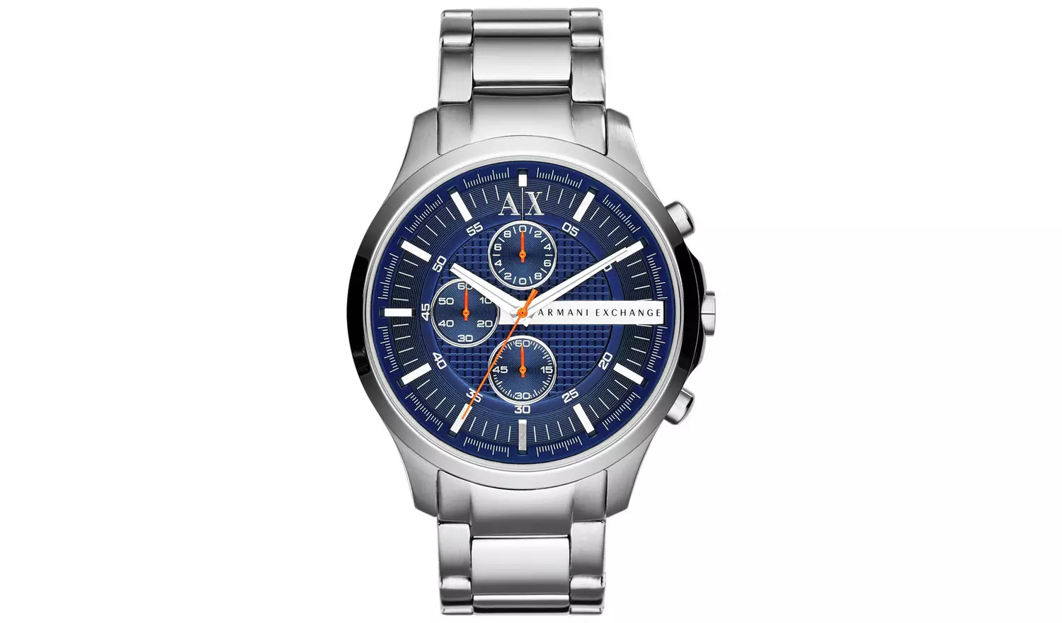 Armani Exchange’s new Hampton Chrono collection shines in classic stainless steel with a navy blue dial and orange accents. 46mm case, 22mm band width, mineral crystal, Quartz movement with 3-hand analog display, imported.