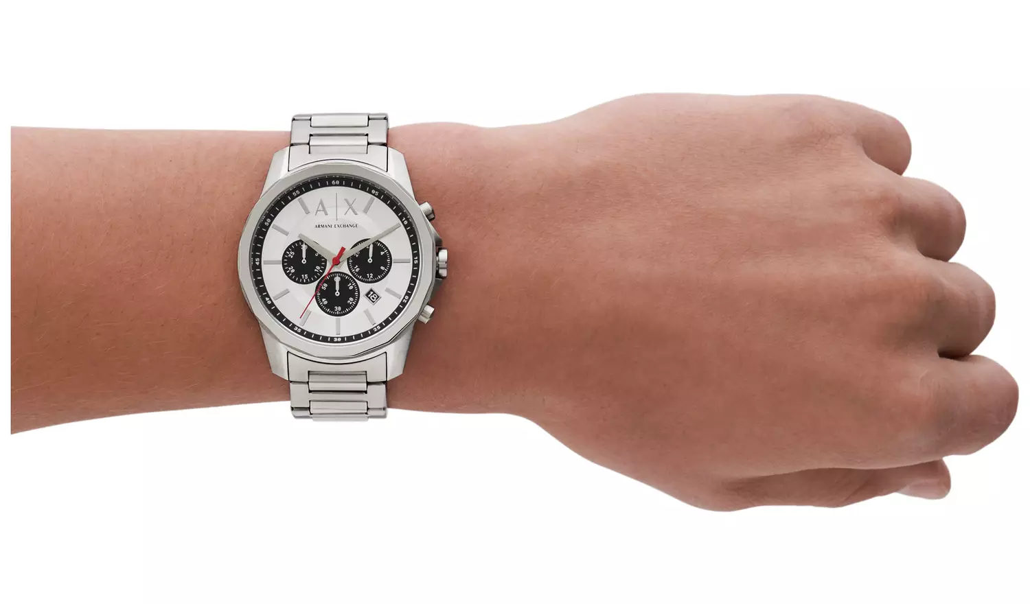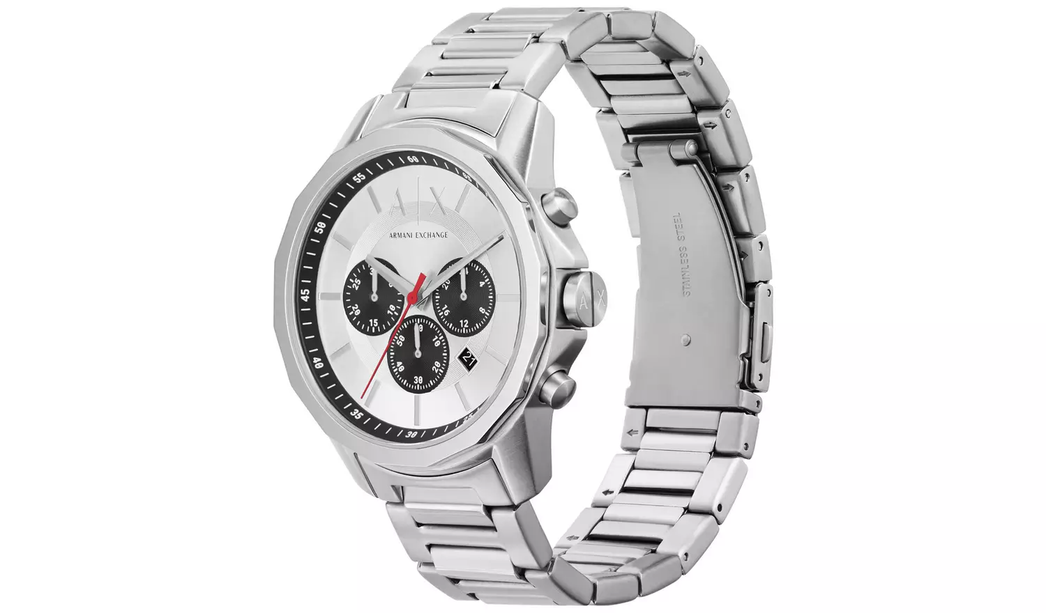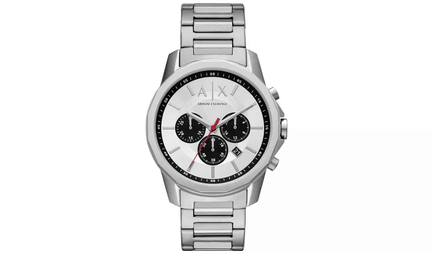 Introducing an impressive 44mm chronograph watch from Armani Exchange featuring a striking silver dial enhanced by sleek black detailing and a red second hand. Finished with a stainless steel bracelet with double push button folding clasp. 50m water resistant.