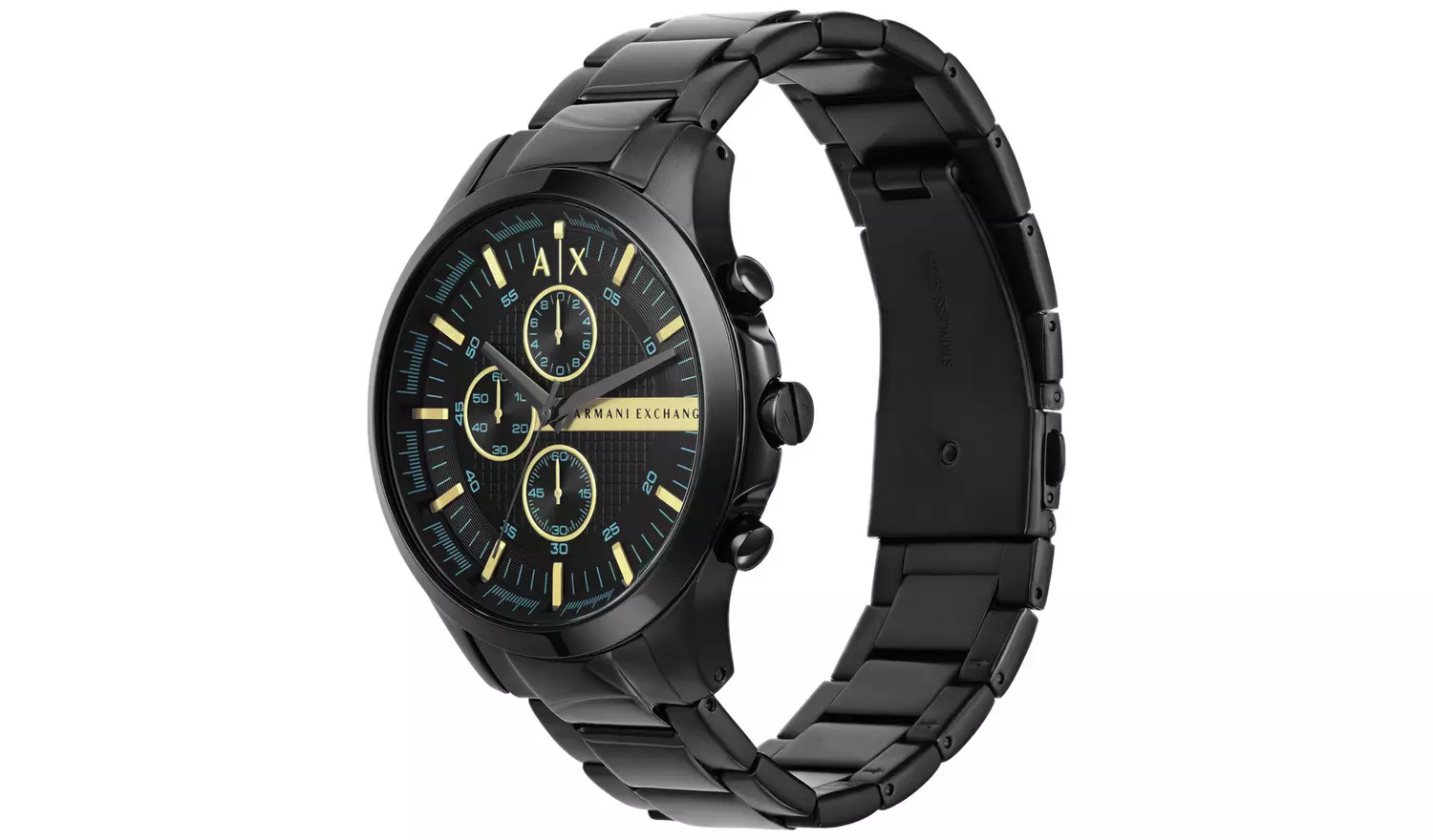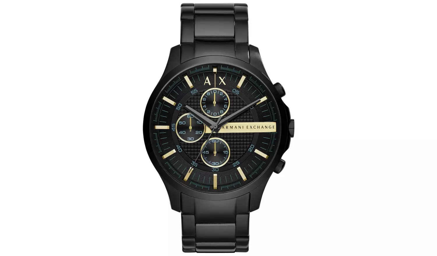 In sleek black plating with gold-tone dial accents, this Armani Exchange timepiece delivers sophisticated style with a functional touch. This modern look watch will help you set the tone wherever you go.