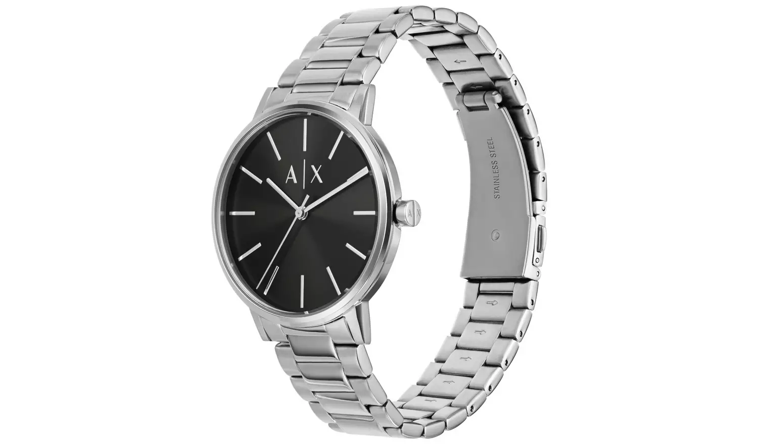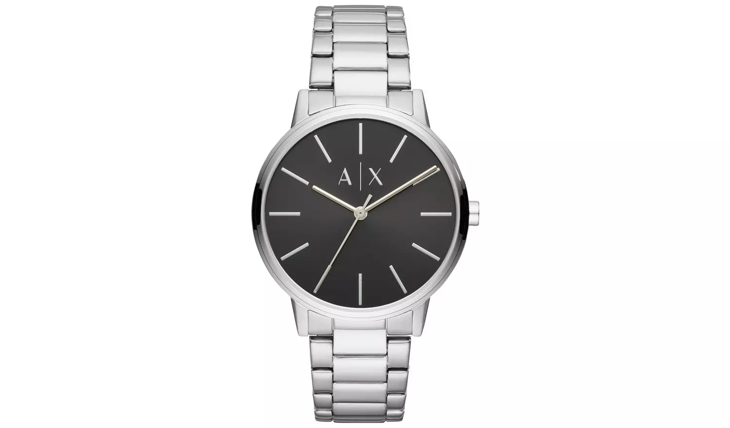 This 42mm Armani Exchange watch gives you a black sunray dial with silver-tone stick indexes, three-hand movement and stainless-steel bracelet. The minimalist, yet stylish look is perfect for those who want to make a classy statement with their watch. The watch is water resistant to 50 metres meaning you could shower with it but swimming is probably not recommended.