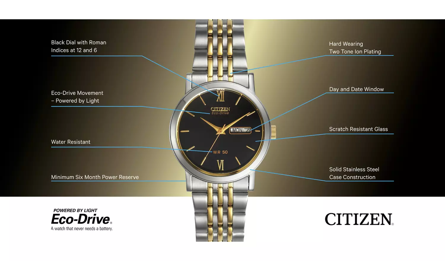 A simple, yet revolutionary concept: a watch that never needs a battery. Citizen Eco-Drive technology harnesses the power of light from any natural or artificial light source and converts it into energy which is stored in a permanently rechargeable lithium-ion cell. It recharges continuously in any kind of light to run forever.