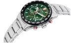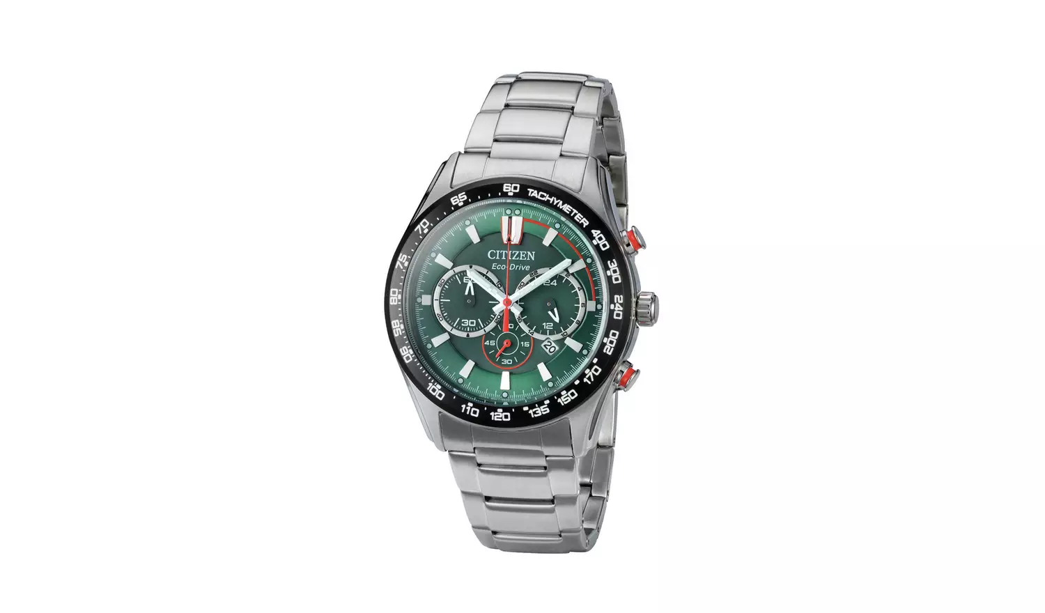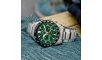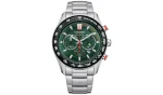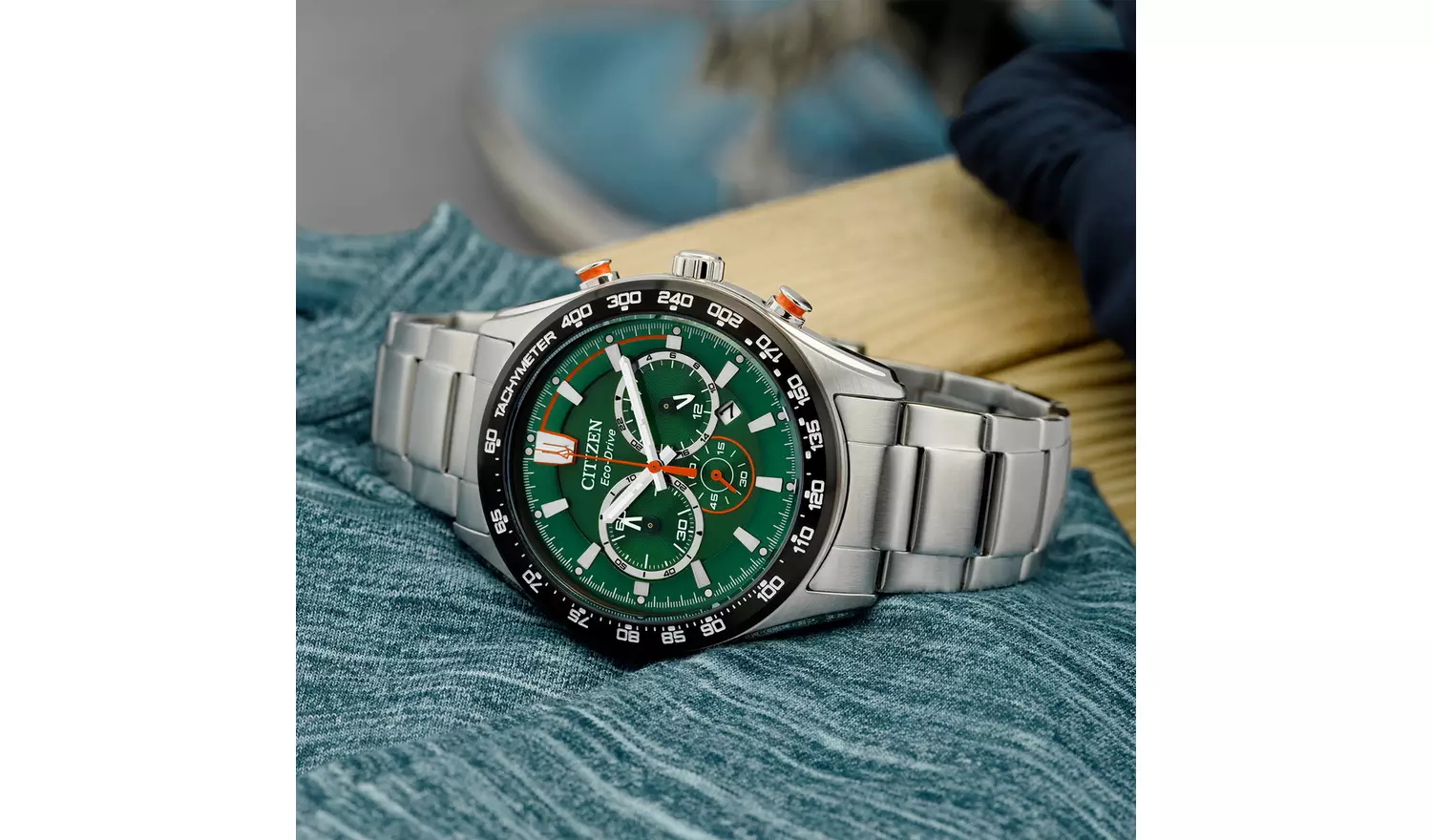 This Sporty Citizen Eco-Drive men’s watch featuring a striking Green dial, comes with a -second chronograph measuring up to 60 minutes, 12/24-hour time, luminous hands and markers, tachymeter, and mineral crystal glass. Perfect for the active wearer, this watch has water resistance to 100 metres and never needs a battery.
