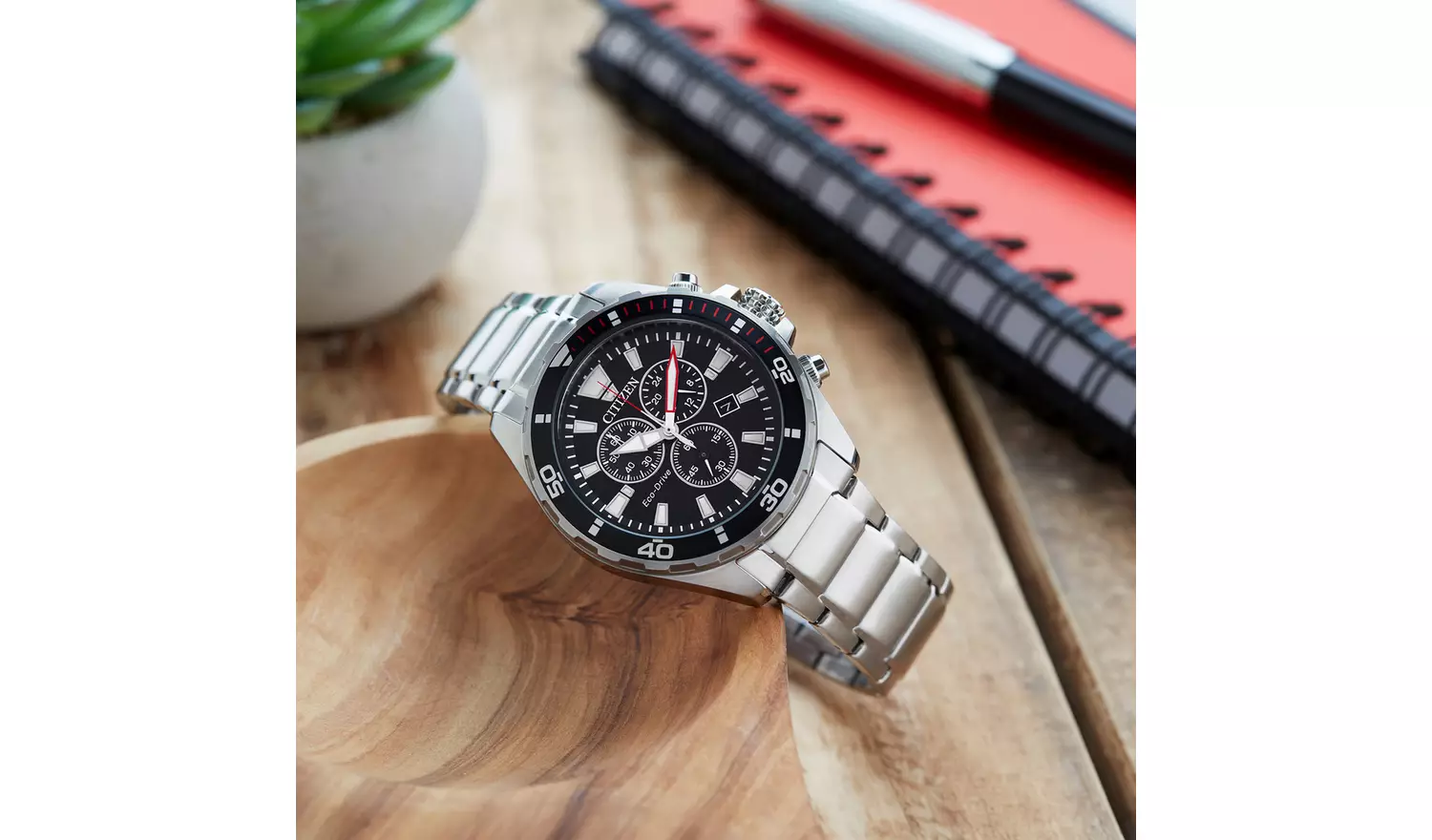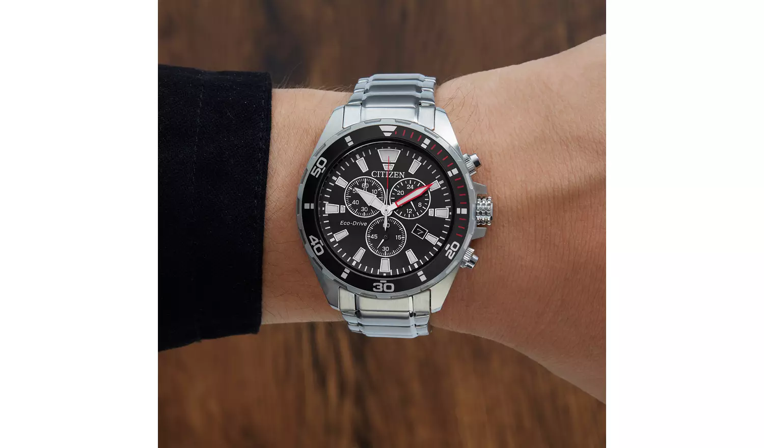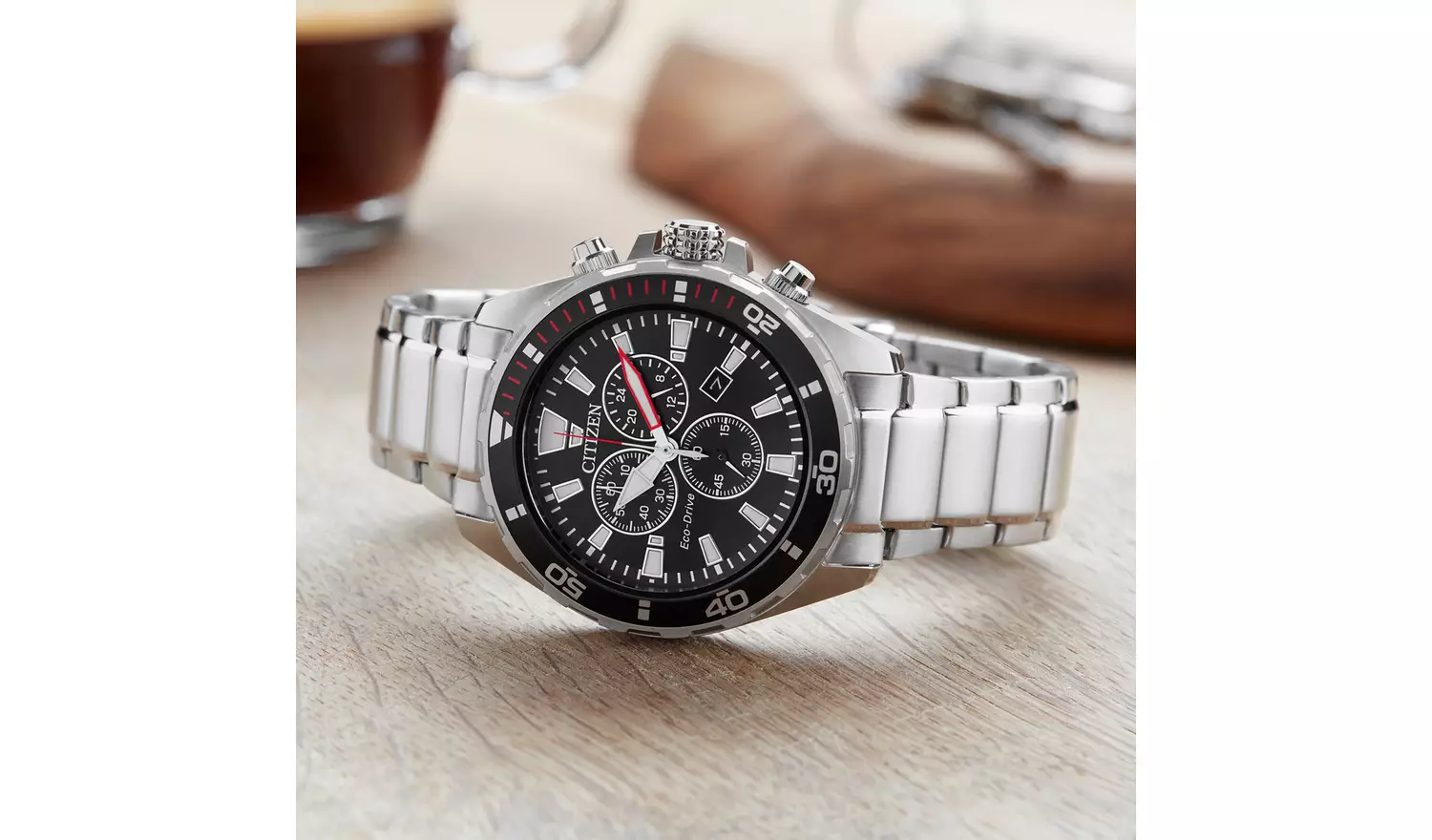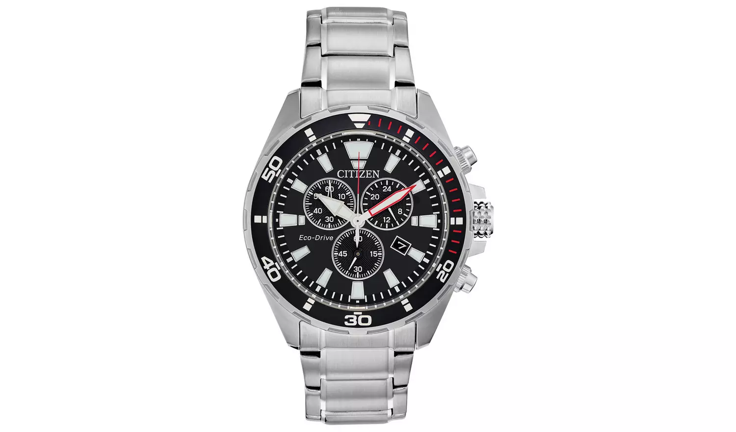 Discover this sporty and stylish Chronograph from Citizen, with 12/24 hour time, date, tachymeter and a one-way rotating elapsed-time bezel. Shown in stainless steel with black dial. Featuring Citizen Eco-Drive technology – powered by light, any light. Never needs a battery.