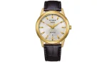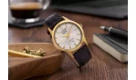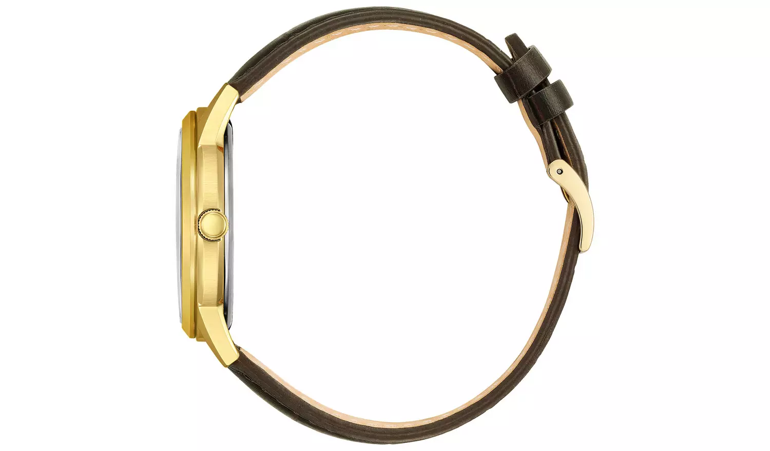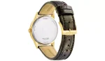 Gents Eco-Drive modern timepiece that displays classic aesthetic appeal. The looks of this watch are equally matched by its reliability. A smooth silver sleek dial with day-date feature on a gold tone case with brown leather strap . Powered by light, any light, never needs a battery.