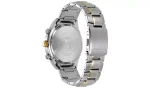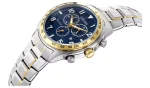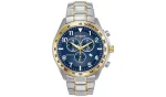 This striking Citizen Eco-Drive men’s two-tone watch features a blue dial with a date display, 1-second chronograph measuring up to 60 minutes, 12/24-hour time, luminous hands and markers, tachymeter, and mineral crystal glass. Perfect for the active wearer, this watch has water resistance to 100 metres and never needs a battery.