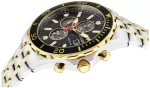 Dignified and polished, this Citizen Eco-Drive gents chronograph watch is the ideal timepiece for you for both everyday practical wear and smart dress occasions. The bold flash of gold colour in the two tone case and bracelet and the subtly patterned black dial all compliment each other perfectly to create a sophisticated and elegant design that is this both stylish and easy to read. The watch has a stopwatch and is water resistant to 100 metres.