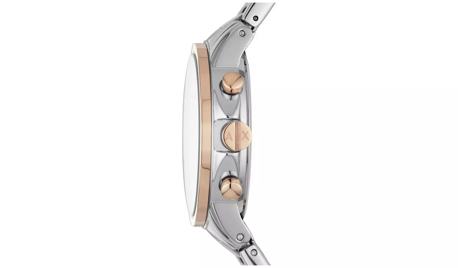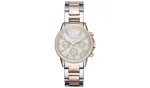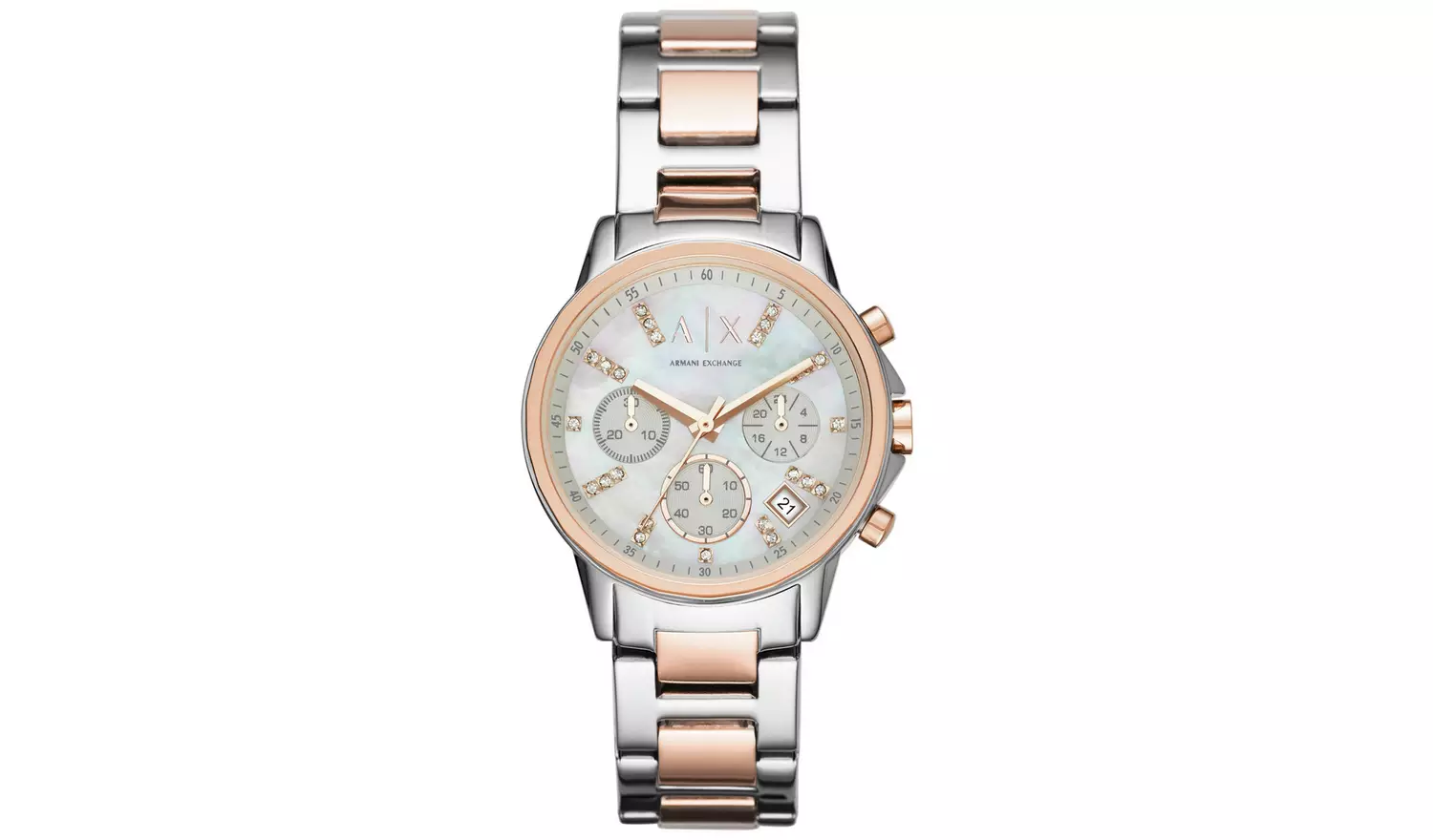 This two tone Armani Exchange womens watch packs a lot into a pretty timepiece. With chronograph and analogue features powered by quartz movement, the AX branded face is packed with function; displaying hours, seconds, minutes and date. Diamante batons mark the hours and the mother of pearl dial adds shimmer. Everything you need in a watch plus tons of style.