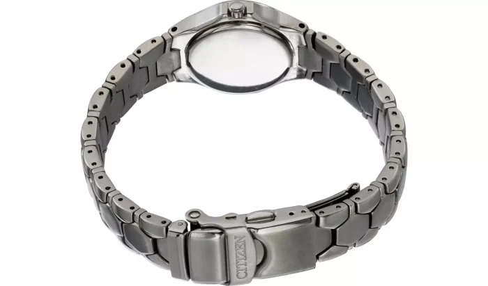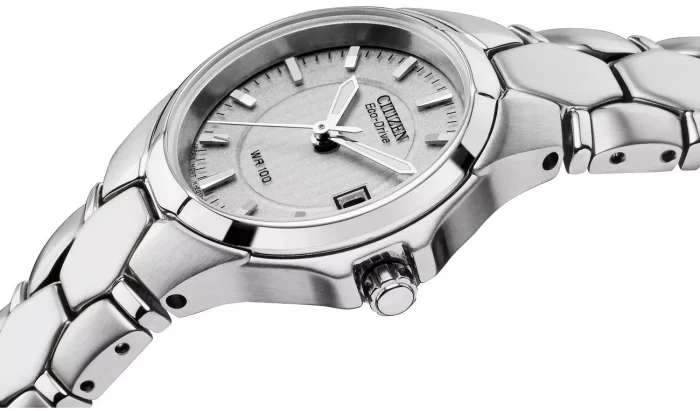 This sleek and stunning ladies silver dial Citizen Eco-Drive bracelet watch adds an extra touch of sophistication to this timepiece. The silver tone stainless steel case and bracelet strap complement the dial to create a refined and elegant design that is sure to look great with any outfit.