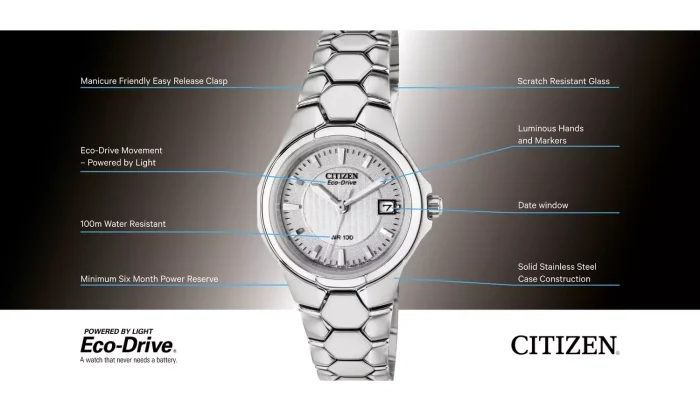 A simple, yet revolutionary concept: a watch that never needs a battery. Citizen Eco-Drive technology harnesses the power of light from any natural or artificial light source and converts it into energy which is stored in a permanently rechargeable lithium-ion cell. It recharges continuously in any kind of light to run forever.